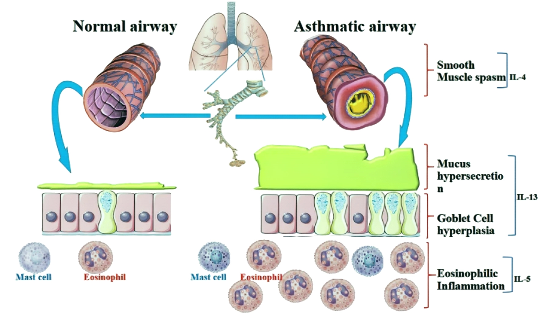 During the development of asthma, various inflammatory cells such as eosinophils, mast cells, and T lymphocytes are recruited to the airways, releasing a series of inflammatory mediators and cytokines, including interleukin-4 (IL-4), interleukin-5 (IL-5), and interleukin-13 (IL-13), which trigger airway inflammation. These inflammatory responses result in damage to the airway epithelium, increased mucus secretion, airway smooth muscle contraction and remodeling, leading to airway hyperresponsiveness and airflow limitation.
