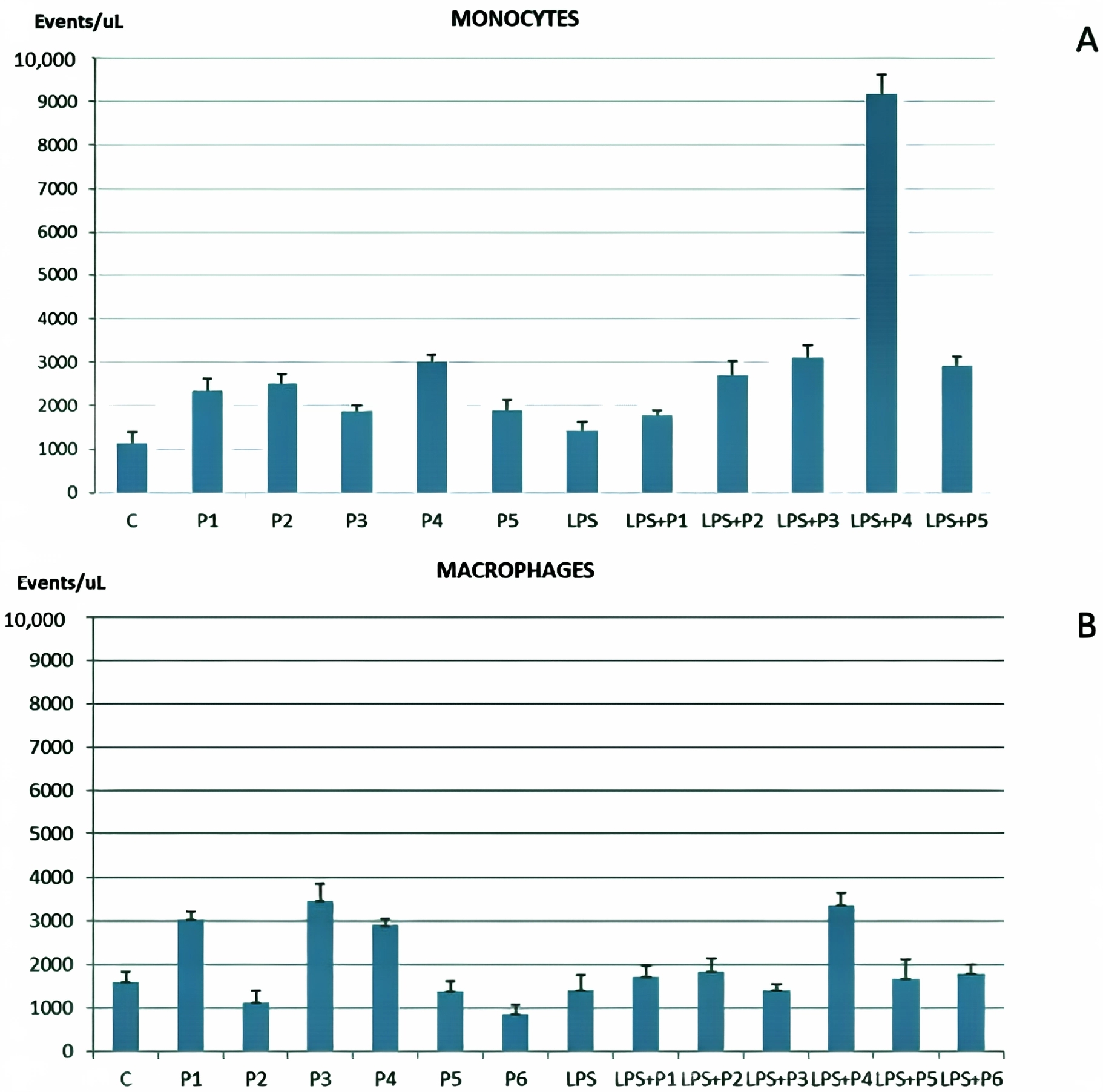 Figure 2 Extracellular vesicle count through cytofluorimetric analysis on monocytes (A) and macrophages (B).