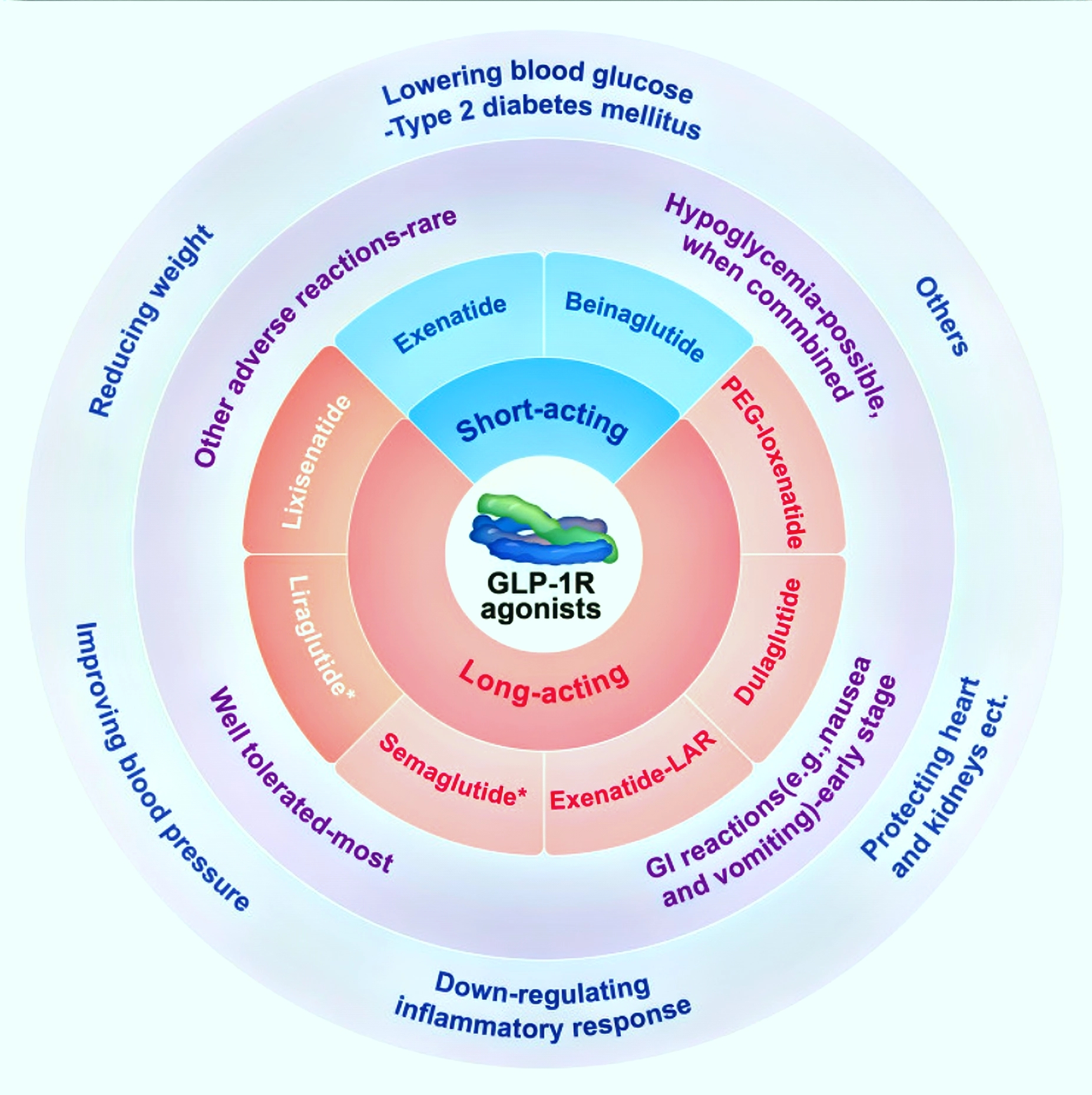 Scheme 1 A schematic overview of GLP-1 receptor agonists: classification, drug safety, and effectiveness. GI, Gastrointestinal; GLP-1R, Glucagon-like peptide-1 receptor; PEG, Polyethylene glycol.