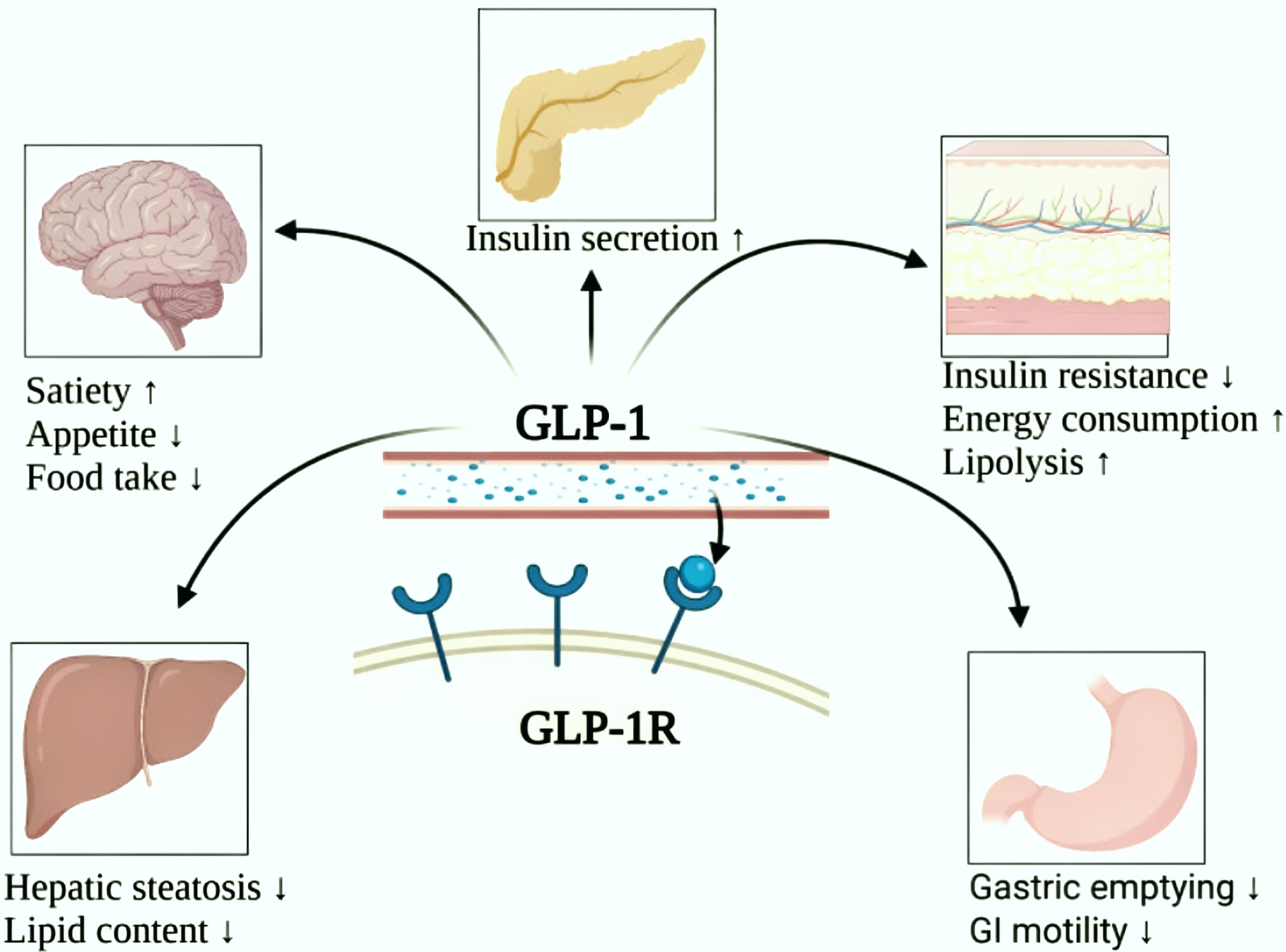 Delaying gastric emptying: GLP-1 RAs slow down the rate at which gastric contents enter the small intestine, prolonging the time food remains in the stomach and producing a sustained sense of fullness. This delayed gastric emptying not only reduces meal size but also stabilizes blood glucose levels, preventing postprandial blood glucose spikes and thereby reducing fat accumulation.