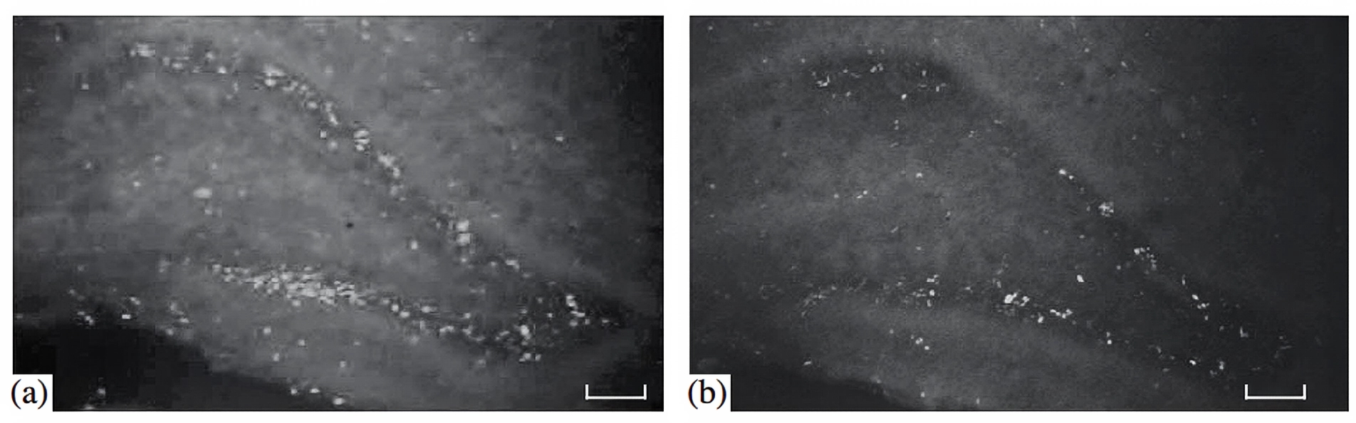 Figure 3 Micrograph of hippocampal dentate area sections immunohistochemically stained with antibodies against the Ki-67 protein: (a) 14-day-old KM rat injected with Sema on days 7–11 after birth and (b) intact 14-day-old KM rat. Scale, 100 µm.