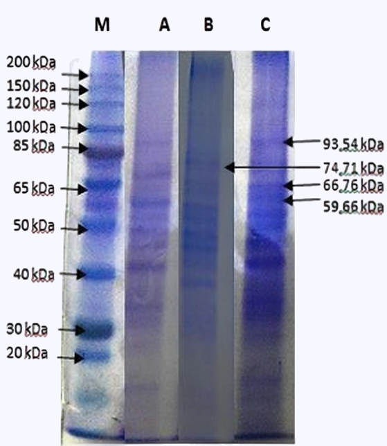 Figure 2 The Potency of Sema Peptide Therapy toward MDA Level and Protein Profile in Epilepsy Rats (Rattus norvegicus). M is marker; A is Group A (negative control); B is group B (positive control); and C is group C (semax peptide therapy).