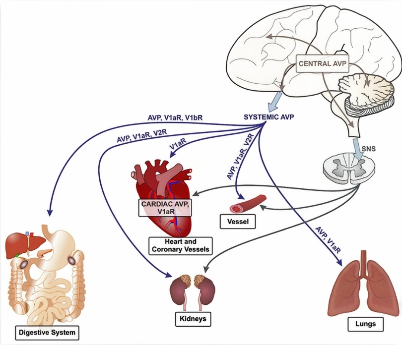 Figure 2. Components of the vasopressin system involved in the regulation of blood flow in the brain, heart, vessels, kidney, lungs and digestive system. AVP—arginine vasopressin; SNS—sympathetic nervous system; V1aR—vasopressin V1a receptors; V1bR—vasopressin V1b receptors; V2R—vasopressin V2 receptors. Source: The Heart as a Target of Vasopressin and Other Cardiovascular Peptides in Health and Cardiovascular Diseases (2022).