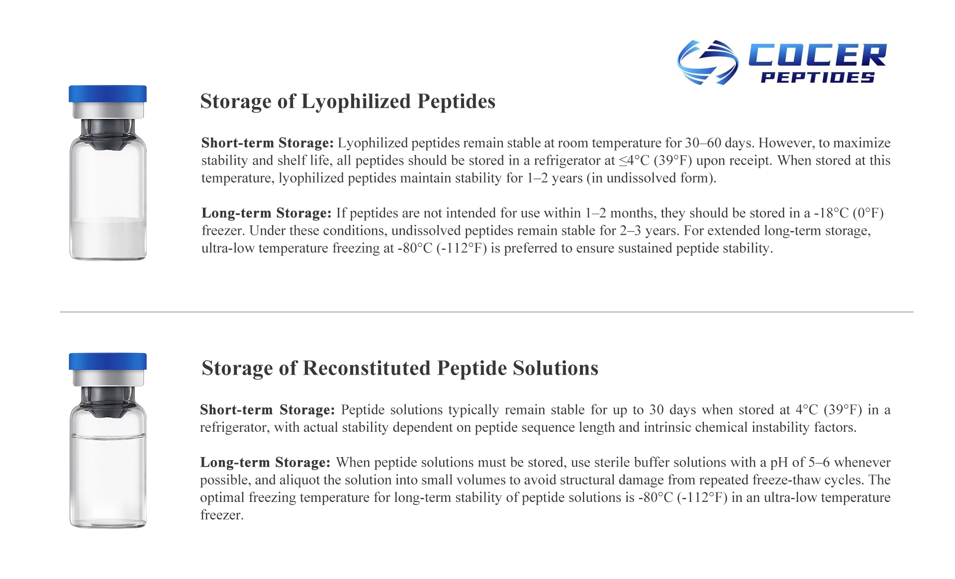 Peptide compounds, owing to their specific amino acid sequences and spatial structures, possess the characteristic that their biological activities are highly susceptible to external environmental influences. The primary rationale for peptide storage is to prevent chemical reactions such as degradation, oxidation, and aggregation, thereby maintaining their structural integrity and biological functions. Chemically, peptide bonds are vulnerable to hydrolytic disruption, while side chain groups may react with environmental moisture, oxygen, or microorganisms, leading to peptide inactivation. Common storage methods include solid-state storage and liquid-state storage. Solid-state storage typically involves converting peptides into dry powders via techniques such as freeze-drying or vacuum drying to minimize the impact of moisture; liquid-state storage dissolves peptides in appropriate solvents, suitable for scenarios requiring ready-to-use dissolved peptides.